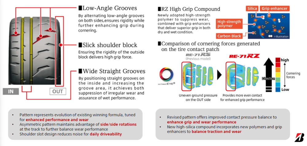 El dibujo general se ha rediseñado para maximizar la superficie de contacto con la carretera y optimizar la eficiencia de las ranuras. El resultado es un mejor equilibrio entre contacto y presión en toda la banda de rodadura, como demuestra Bridgestone mediante su simulación ULTIMAT EYE: mientras que el RE-71RS mostraba una presión desigual sobre el suelo, concentrada en el borde exterior al tomar curvas, el RE-71RZ ofrece una superficie de contacto más uniforme, distribuyendo las fuerzas en las curvas de forma más uniforme para un mejor agarre.