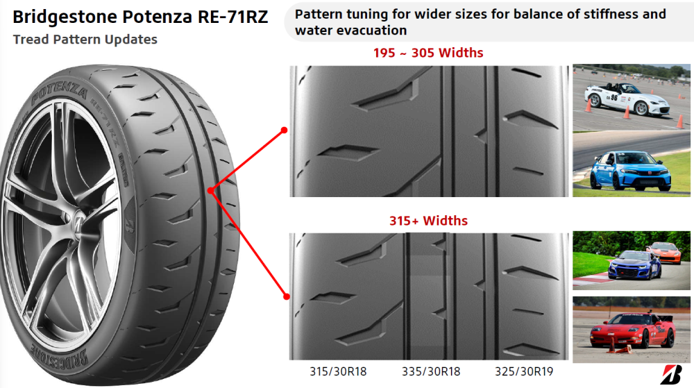 Bridgestone también ha introducido un ajuste del dibujo que varía según el ancho de la sección. Los tamaños de 195 a 305 mm utilizan la geometría estándar del dibujo, mientras que los anchos de 315 mm o superiores (315/30R18, 335/30R18, 325/30R19) reciben un dibujo modificado, optimizado para equilibrar la rigidez de la banda de rodadura y la evacuación de agua en esas huellas más anchas. Este es un detalle importante para Corvette, 911 y otros modelos de neumáticos traseros anchos, donde un dibujo único puede comprometer el agarre o la seguridad en mojado.